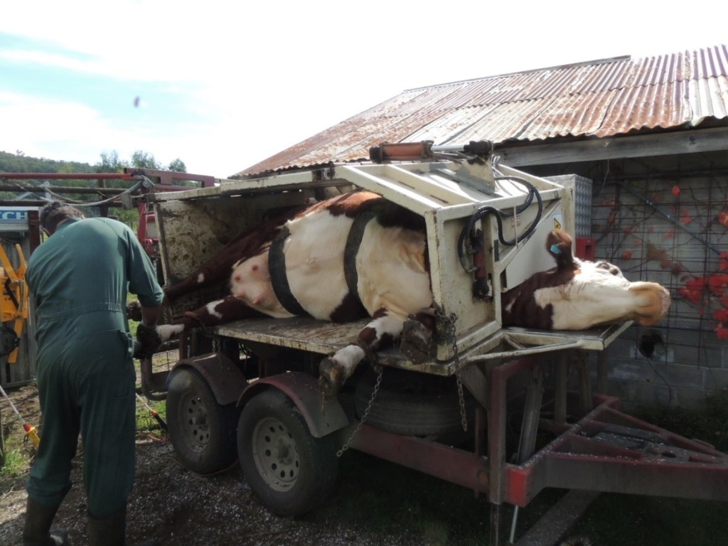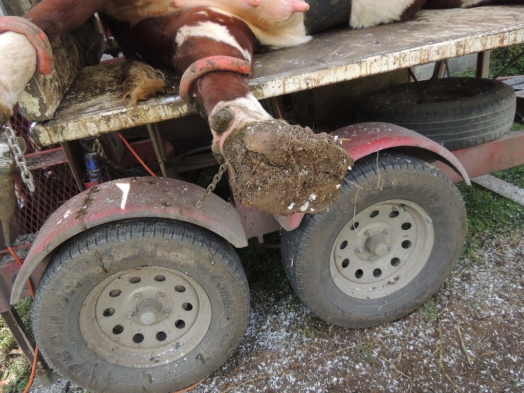In this photo you can see the length of toe and, whilst it hasn’t started to curl, would do so if untrimmed. Cattle don’t pick their feet up like a horse is able to do so a specially designed trailer is used to make a trimming job easy and safe and low stress for the cow.